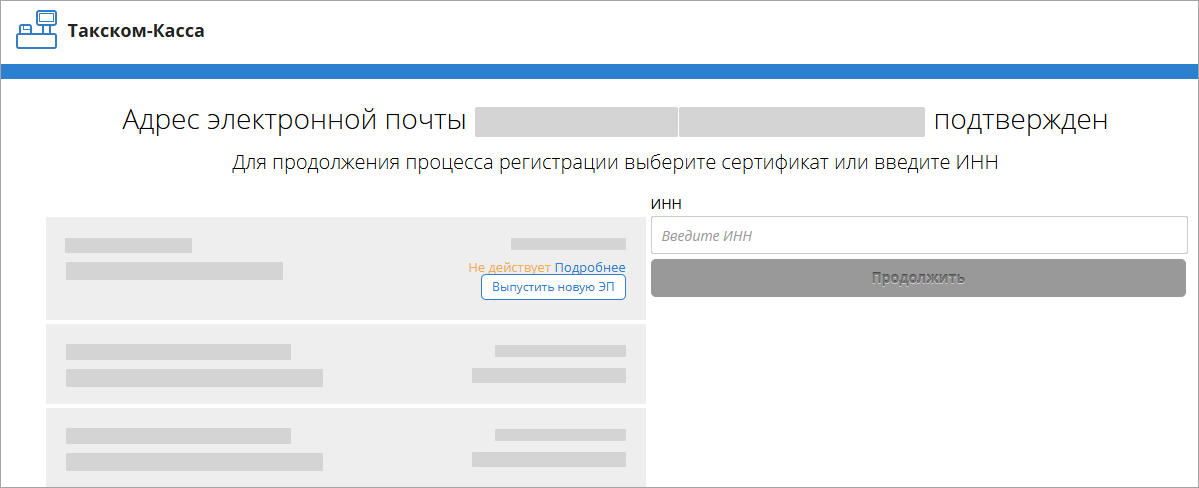 При отсутствии установленной ЭП нужно указать ИНН (ввод КПП обязателен при регистрации филиала или иностранной организации) и нажать Продолжить.